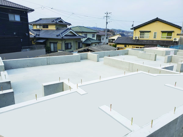 住宅の土台となる基礎は優れた安定性と強度を持つ「ベタ基礎」を採用しています。しっかりと地盤調査を行った地面を鉄筋コンクリートで覆い固めることで、住宅をコンクリートの底板全体で受け止めて重量を分散し、支えることが出来ます。