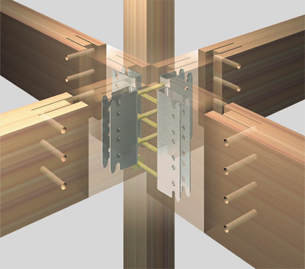 在来工法は加工時に断面欠損が大きくなるため、その部分の材料強度が落ちてしまいます。そこで、通し柱に無垢材対応接合金物を使用しています。材料の欠損を極力減らして接合出来るため、材料強度の低下を大幅に防ぎます。